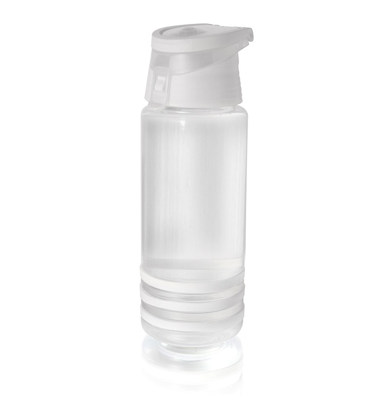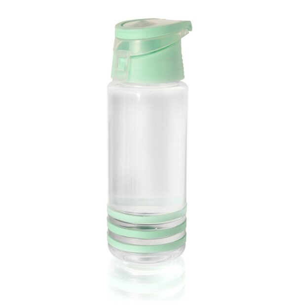 Botella plástica con cierre hermético y manija rebatible. Cuerpo cristal y tapas en colores combinados con el grip. Capacidad 850cc.